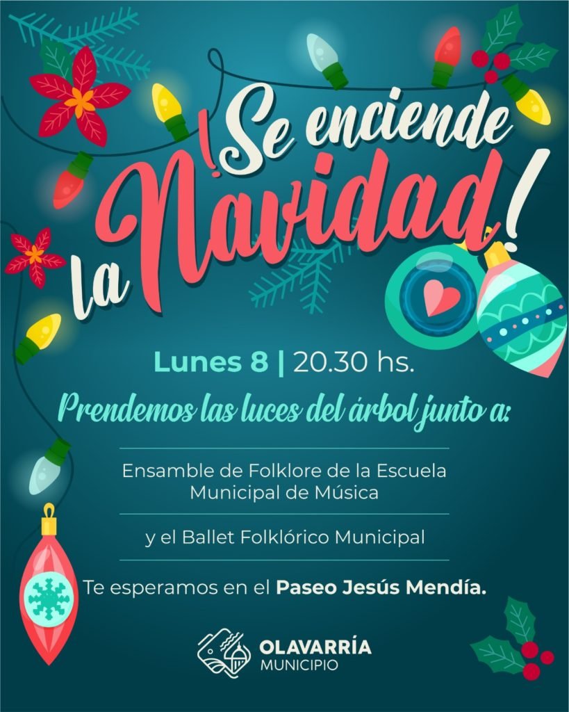 El Municipio de Olavarría invita a ser parte de una jornada navideña especial que se llevará a cabo el próximo lunes 8 de diciembre, a las 20:30 horas, en el Paseo Jesús Mendía.