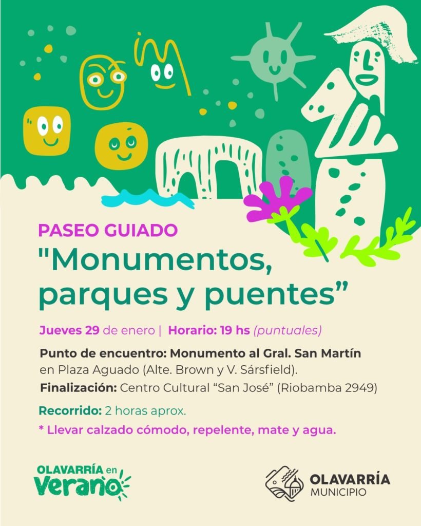El Municipio de Olavarría, a través de la Coordinación de Turismo, invita a participar de una nueva edición del paseo guiado “Monumentos Parques y Puentes”. La propuesta que se lleva a cabo en el marco del programa “Olavarría en verano”, consiste en una caminata guiada gratuita diseñada para que vecinos, vecinas y visitantes puedan profundizar en el conocimiento del patrimonio histórico, cultural y geográfico de nuestra ciudad.