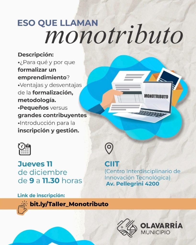 El Municipio de Olavarría anunció la realización del taller “Eso que llaman Monotributo”, una propuesta impulsada por la Coordinación de Economía Popular, área dependiente de la Secretaría de Desarrollo Económico y Productivo. La actividad tendrá lugar el jueves 11, de 9 a 11 horas, en el Centro Interdisciplinario de Innovación Tecnológica, ubicado en el edificio del Museo de Ciencias del Polo Recreativo y Educativo Municipal “La Máxima”.