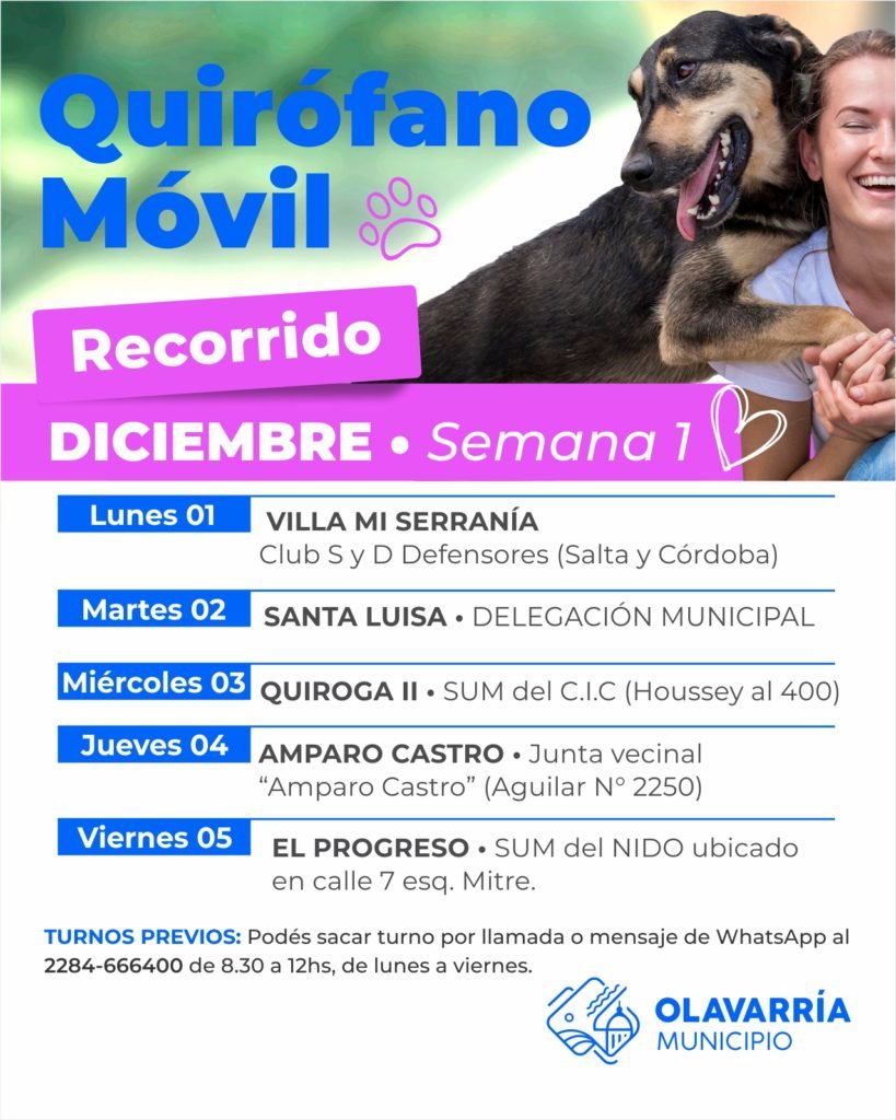 El Municipio de Olavarría, informa que el Quirófano Veterinario Móvil continúa con su recorrido por distintos barrios de la ciudad y localidades del Partido, ofreciendo de manera gratuita esterilizaciones quirúrgicas caninas y felinas, en el marco de la campaña “Querer es Cuidar”.