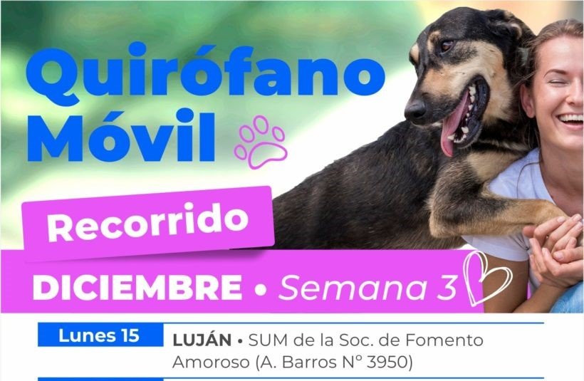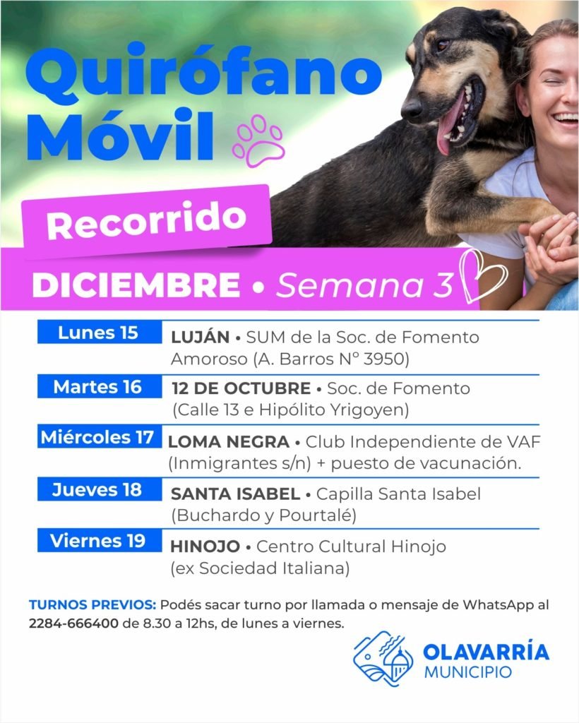 El Municipio de Olavarría, informa que el Quirófano Veterinario Móvil continúa con su recorrido por distintos barrios de la ciudad y localidades del Partido, ofreciendo de manera gratuita el servicio de esterilizaciones quirúrgicas caninas y felinas, en el marco de la campaña “Querer es Cuidar”.
