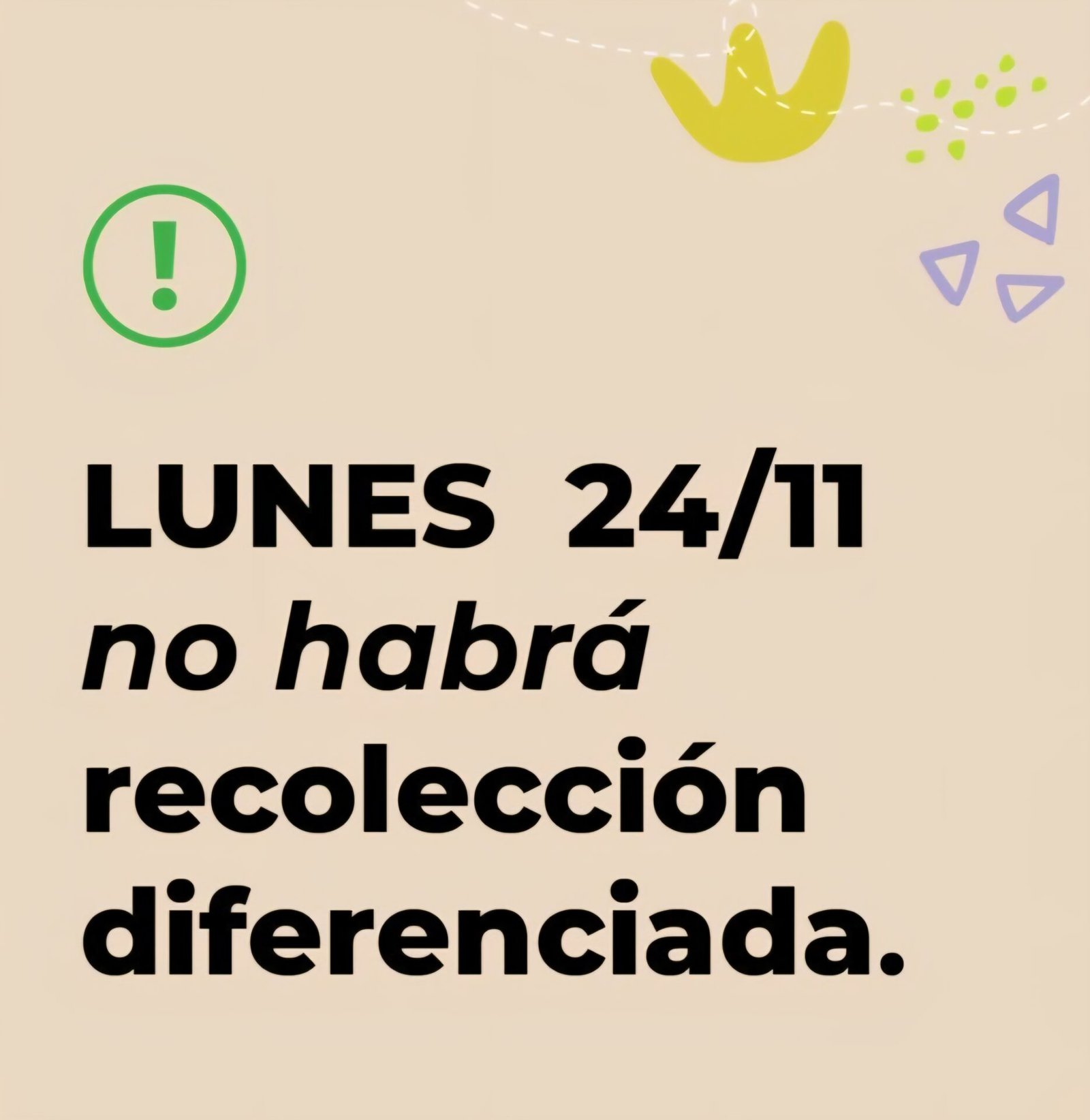 El Municipio de Olavarría, en el marco del Programa de Gestión Integral de Residuos de Olavarría (GIRO), informa que con motivo del Feriado Nacional este lunes 24 de noviembre no se realizará recolección diferenciada de residuos, como así tampoco tareas en la Planta de Clasificación.