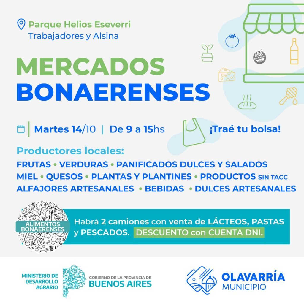 El Municipio , a través de la Coordinación de Economía Popular de la Secretaría de Desarrollo Económico y Productivo, informa que el martes 14 de octubre se llevará a cabo una nueva edición del programa “Mercados Bonaerenses”. Vale destacar, a la par, que debido a las condiciones climáticas se postergó la jornada programada para este sábado.