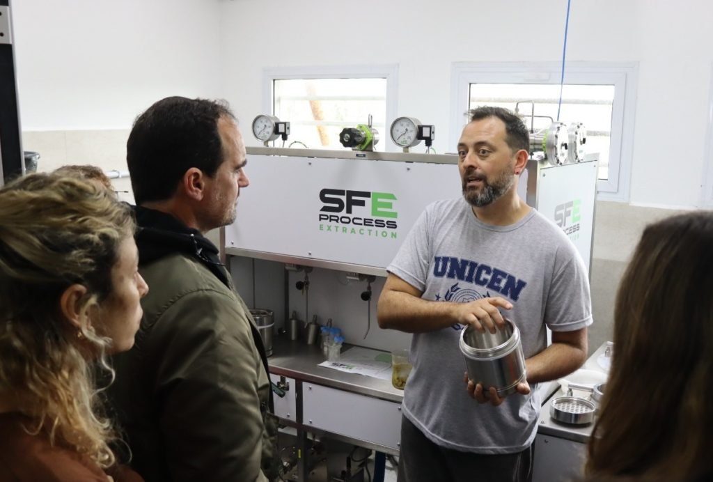 Durante la recorrida, los investigadores mostraron el espacio de cultivo, el laboratorio y el equipo de extracción CO2 supercrítico, que permite realizar extracciones selectivas de sustancias naturales aplicables a las industrias alimentaria, cosmética, farmacéutica y de bebidas.