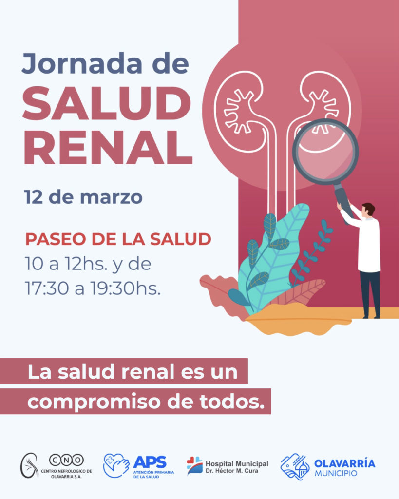 El Municipio de Olavarría invita a participar de una jornada de concientización sobre salud renal, abierta a toda la comunidad, que se llevará a cabo el próximo jueves 12 de marzo en el Paseo de la Salud (Brown y Belgrano).