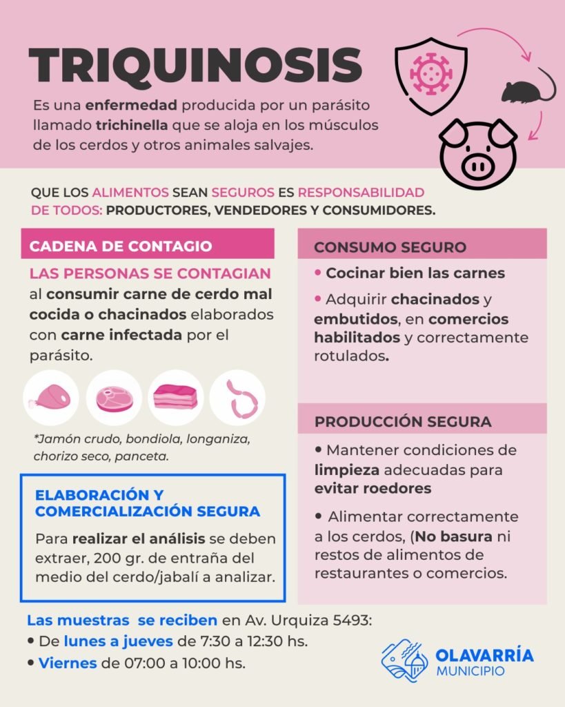El Municipio de Olavarría, a través de la Dirección de Veterinaria, reforzó la difusión de medidas de prevención y control de la Triquinosis, una enfermedad parasitaria causada por larvas y parásitos adultos del género Trichinella que puede afectar a humanos y a distintas especies animales.