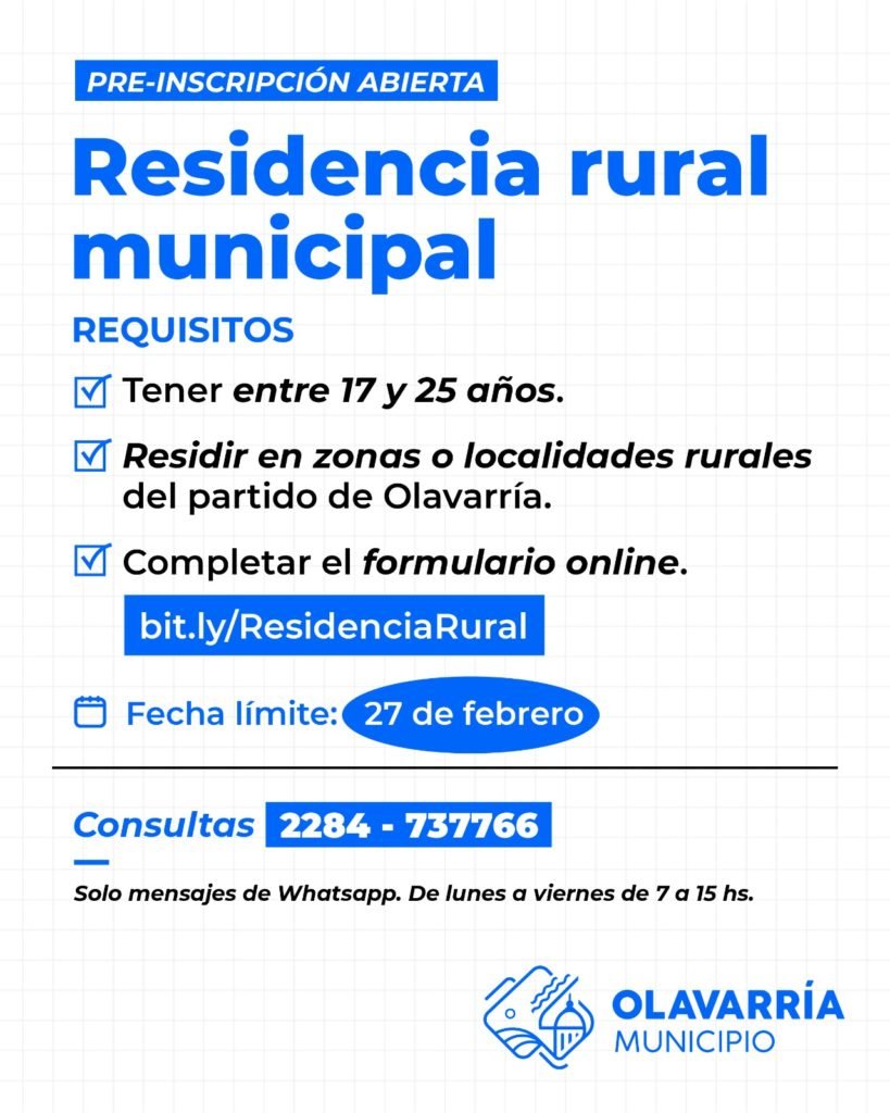 Los requisitos para anotarse son tener entre 17 y 25 años y residencia real en zona o localidades rurales del Partido de Olavarría. Por consultas e inquietudes, aquellas personas interesadas se pondrán comunicar vía WhatsApp al 2284 737766, solo mensajes, de lunes a viernes en el horario de 7 a 15 horas.