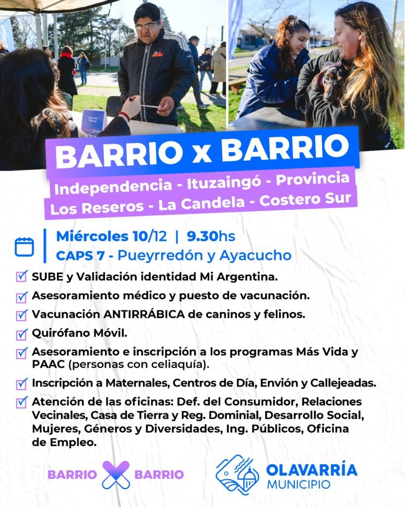 El Municipio de Olavarría, tal como se lo realiza desde hace ya más de un año, llevará a cabo este miércoles una jornada más del Programa Municipal Barrio por Barrio, el dispositivo de abordaje territorial e integral que acerca a la comunidad la gestión de trámites y servicios que son brindados desde la comuna. En este caso será el turno de los barrios Independencia, Ituzaingó, Provincia, Los Reseros, La Candela y Costero Sur.