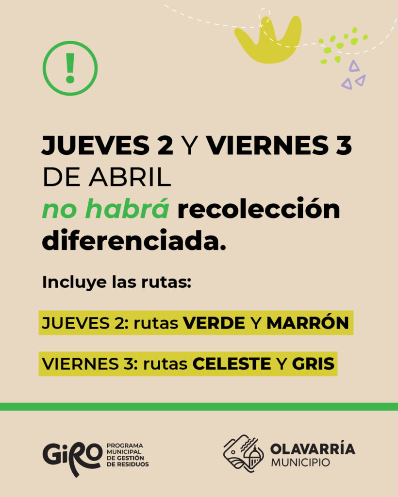La recolección de residuos reciclables no se realizará el jueves 2 y el viernes 3 de abril en distintos sectores de Olavarría, debido a los feriados nacionales de ambas jornadas. Así lo informó el Municipio a través de la Coordinación de Ambiente, en el marco del Programa de Gestión Integral de Residuos.