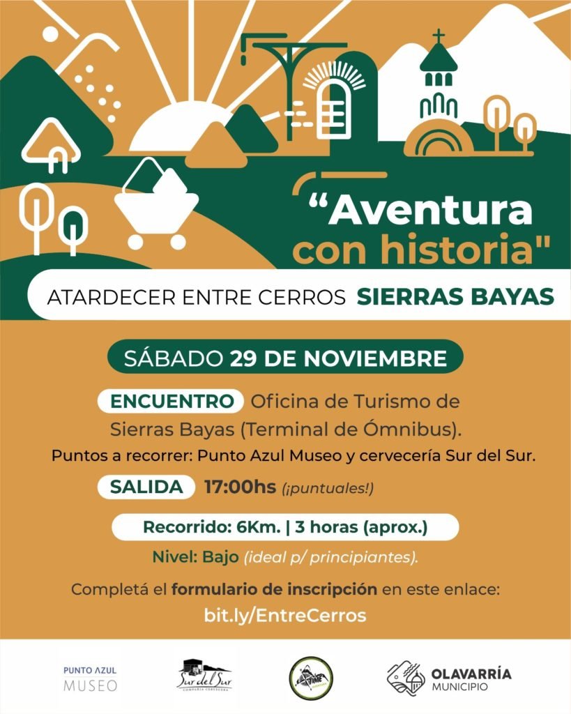 Aventura con historia “Atardecer entre cerros”, se llevará a cabo este sábado 29 de noviembre, con un recorrido de 6 km, de dificultad baja, que se iniciará desde las 17 horas. El punto de encuentro será la Oficina de Turismo de Sierras Bayas ubicada en la Terminal de la localidad. (Clic aquí para ver la ubicación)