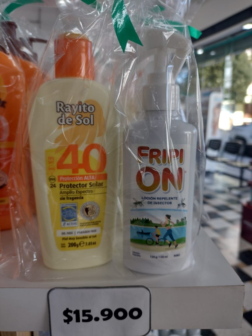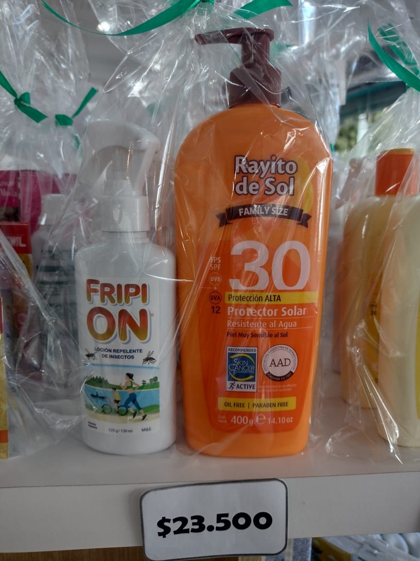 Allí ofrecen combos de protector solar y loción repelente de insectos, por un total de 15.900 pesos.