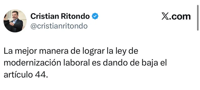 De cara al tratamiento del proyecto en la Cámara baja, el jefe de la bancada de diputados del PRO, Cristina Ritondo, sostuvo desde  su cuenta de X que “la mejor manera de lograr la ley de modernización laboral es dando de baja el artículo 44”.