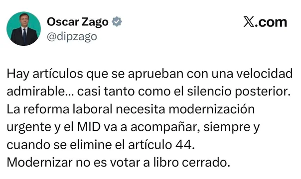 En la misma línea se pronunció Oscar Zago, diputado cercano al bloque de La Libertad Avanza: “Hay artículos que se aprueban con una velocidad admirable… casi tanto como el silencio posterior”, deslizó en X.