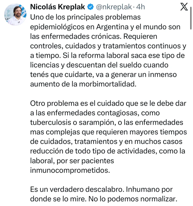 “Requieren controles, cuidados y tratamientos continuos y a tiempo. Si la reforma laboral saca ese tipo de licencias y descuentan del sueldo cuando tenés que cuidarte, va a generar un inmenso aumento de la morbimortalidad”, advirtió en X.