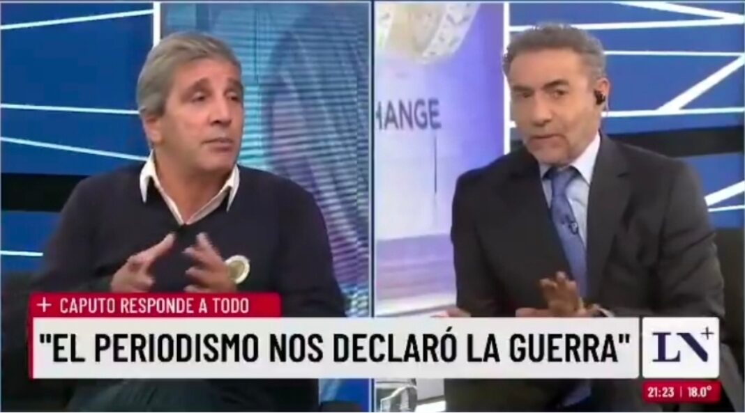 “Yo tengo periodistas de este canal llamando a gente que conozco diciéndoles que los están forzando a pegarnos”. Con esa frase, el ministro Luis Caputo encendió la pantalla de LN+ para tratar de instalar su relato de persecución.