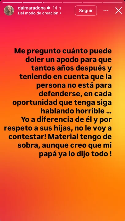 La primera en reaccionar fue Dalma, quien cuestionó que Macri siga hablando del Diez cuando ya no puede defenderse. La actriz sostuvo que tiene “material de sobra” para responderle, pero que por respeto no lo hará, y agregó que le resulta llamativo que haya quienes critiquen ahora a su padre cuando, según aseguró, no se animaban a decirle esas cosas en persona.
