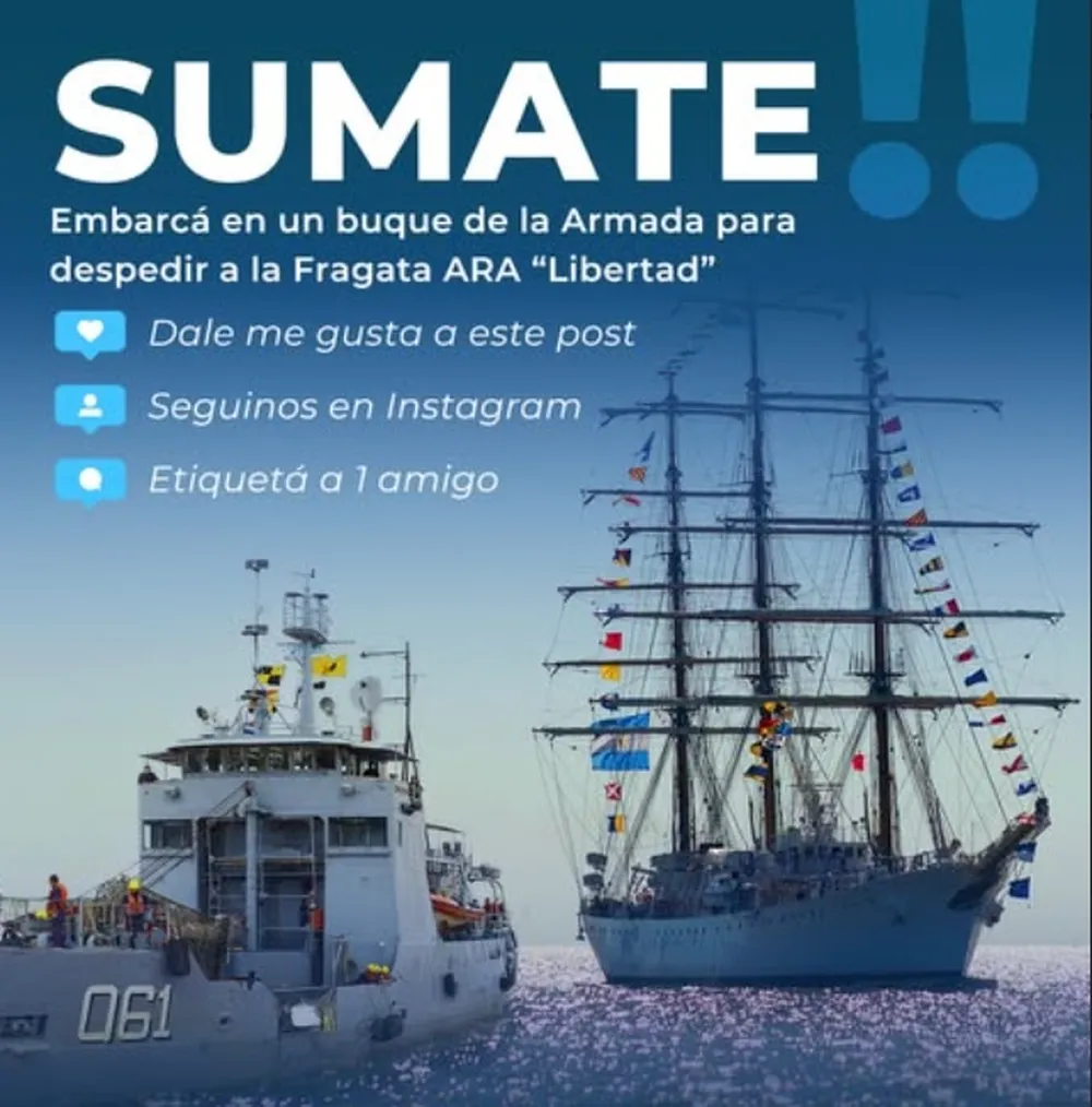Mediante sus redes sociales, la Armada Argentina invita a un sorteo abierto al público para integrar la tripulación de uno de los buques que escoltarán a la Fragata Libertad en su zarpada anual. La experiencia se vivirá el próximo sábado 11 de abril, dando inicio al quincuagésimo cuarto Viaje de Instrucción número 54 del buque escuela.