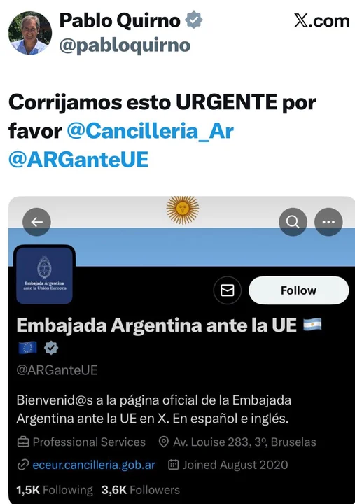 Según supo la Agencia Noticias Argentinas, el malestar del titular del Palacio San Martín se desencadenó al visualizar la biografía de la cuenta en X (ex Twitter) de la sede diplomática, donde se leía: «Bienvenid@s a la página oficial de la Embajada Argentina ante la UE».
