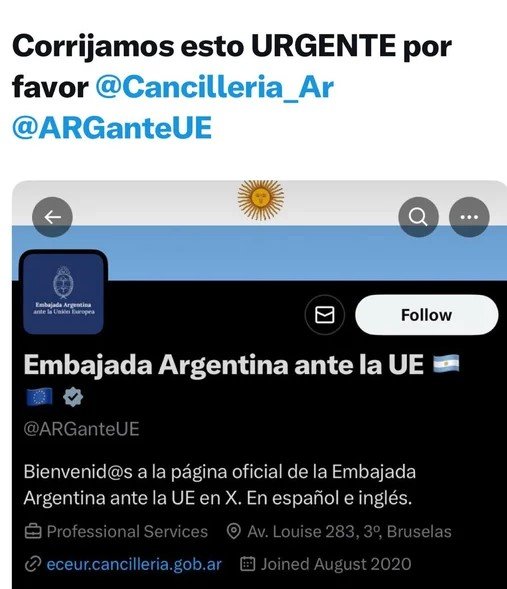 La reacción del ministro de Relaciones Exteriores fue inmediata. Utilizando la misma plataforma, citó el perfil de la embajada (@ARGanteUE) con una directiva tajante: «Corrijamos esto URGENTE por favor @Cancilleria_Ar».