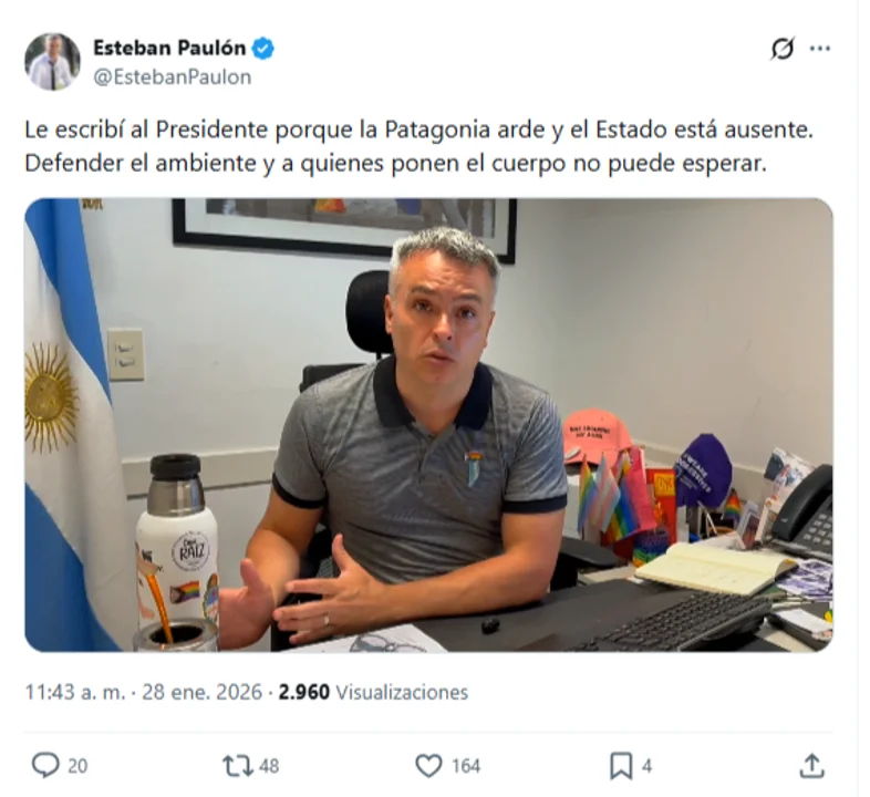 El diputado nacional de Provincias Unidas Esteban Paulón le escribió este miércoles una carta al presidente Javier Milei para pedirle que “deje los shows musicales para otro momento” y se “ocupe” urgentemente de mitigar el desastre ecológico que están dejando los incendios en la Patagonia.