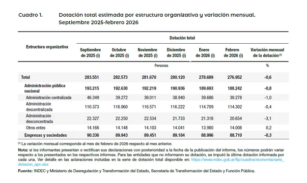 Respecto de enero, la dotación descendió 0,6% y en la administración pública retrocedió 0,8%.