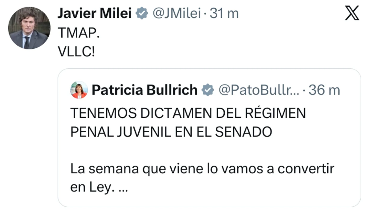 “La semana que viene lo vamos a convertir en ley. En la Argentina no puede haber más víctimas y familias destruidas ni impunidad de menores que se escudan en su edad para salir a delinquir y volver a su casa como si nada”, expresó desde sus redes sociales.