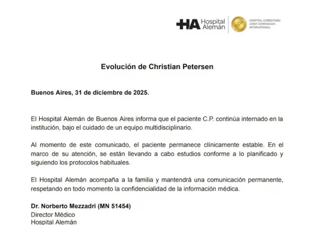 El Hospital Alemán de Buenos Aires dio a conocer este miércoles 31 de diciembre un nuevo informe médico sobre el estado de salud de Christian Petersen. Según el comunicado oficial, el reconocido chef continúa internado en la institución, bajo seguimiento permanente de un equipo especializado, y su evolución se mantiene estable.