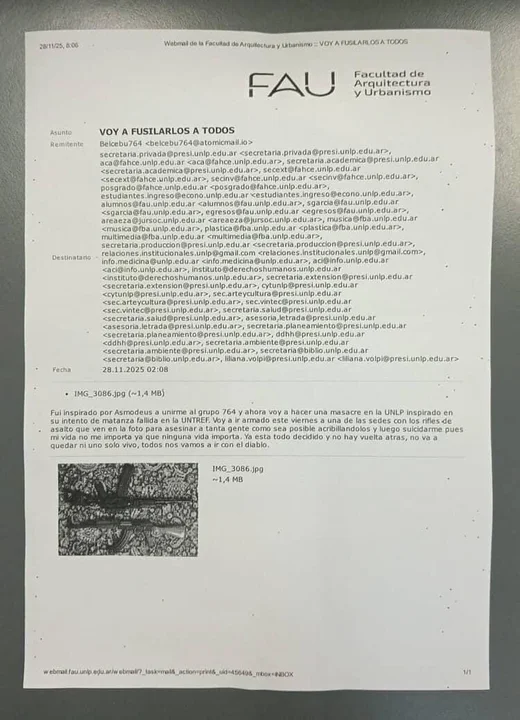 a decenas de dependencias de la UNLP: Secretaría Privada, Académica, Ingreso, Posgrado, Extensión, Arte y Cultura, Salud, y otras áreas administrativas. En el mensaje, el autor aseguró que planeaba “hacer una masacre en la UNLP inspirado en la matanza fallida en la UNTREF” y que “no va a quedar ni uno solo vivo”.