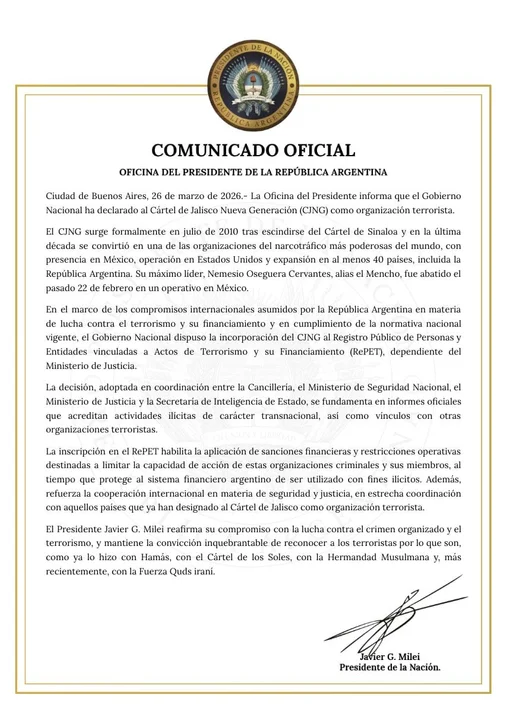 “El presidente Javier Milei reafirma su compromiso con la lucha contra el crimen organizado y el terrorismo, y mantiene la convicción inquebrantable de reconocer a los terroristas, porque lo son, como ya lo hizo con Hamas, con El Cártel de Los Soles, con la Hermandad Musulmana y más recientemente con la fuerza Quds iraní”, concluye el comunicado. (NA)