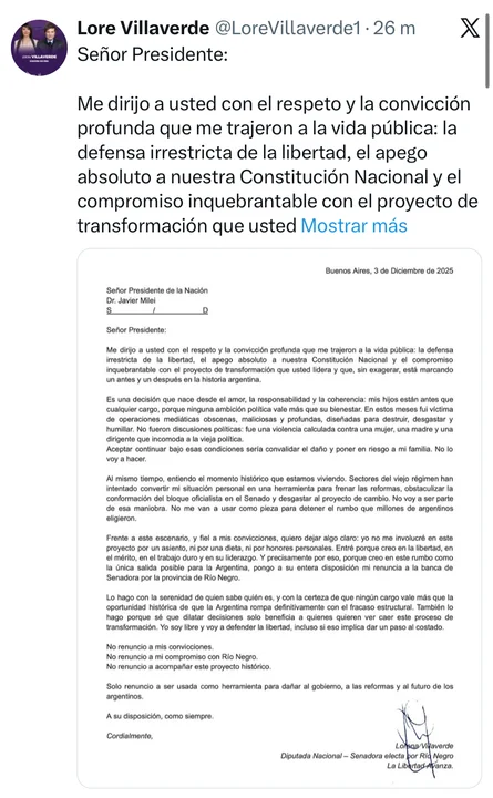 “Frente a este escenario, y fiel a mis convicciones, quiero dejar algo claro: yo no me involucré en este proyecto por un asiento, ni por una dieta, ni por honores personales. Entré porque creo en la libertad, en el mérito, en el trabajo duro y en su liderazgo. Y precisamente por eso, porque creo en este rumbo como la única salida posible para la Argentina, pongo a su entera disposición mi renuncia a la banca de Senadora por la provincia de Río Negro”.