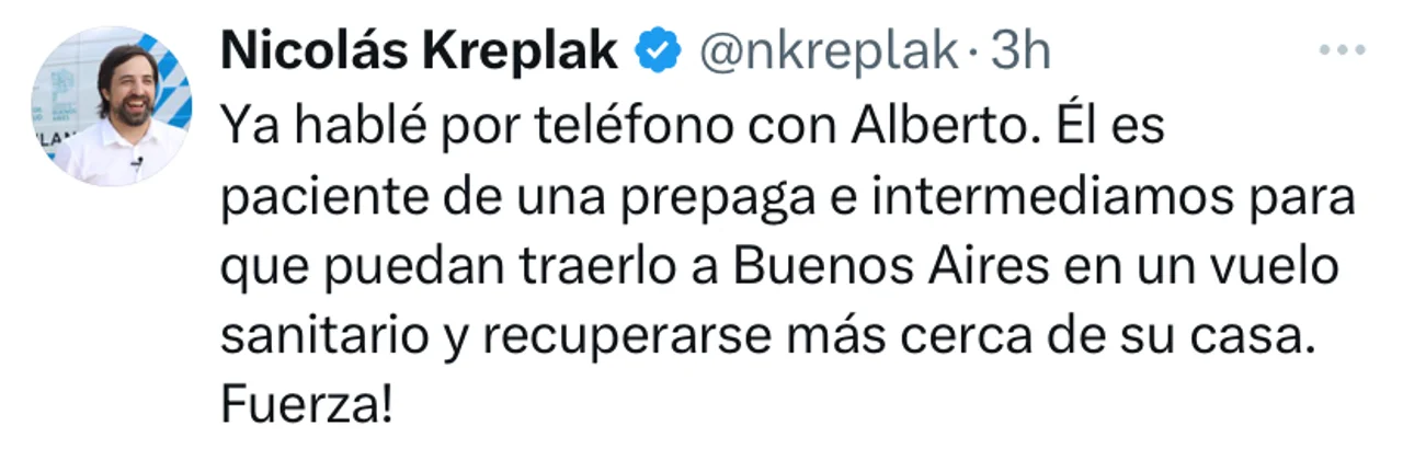 “Ya hablé por teléfono con Alberto. Él es paciente de una prepaga e intermediamos para que puedan traerlo a Buenos Aires en un vuelo sanitario y recuperarse más cerca de su casa. Fuerza!”, escribió el funcionario de la gestión de Axel Kicillof en su cuenta de X.