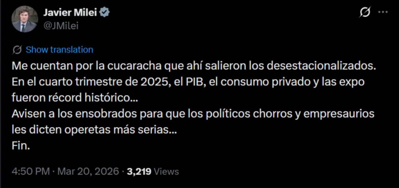 El presidente Javier Milei se refirió al crecimiento del Producto Interno Bruto (PIB) total de 2025 y apuntó, una vez más, contra los “empresaurios” y “políticos chorros”.