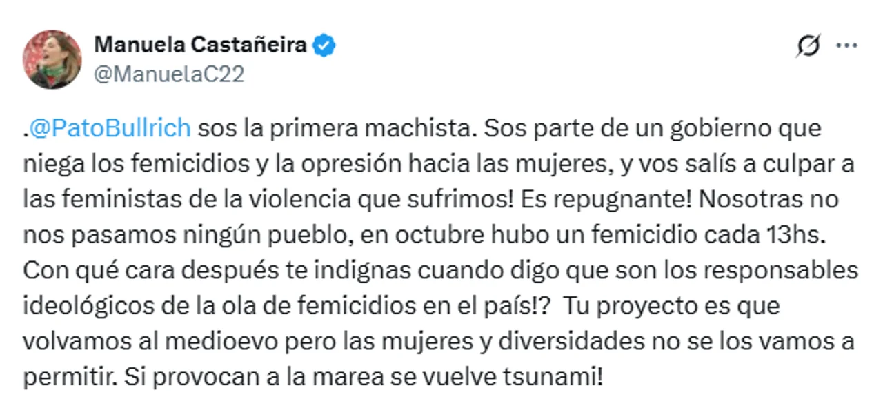 A través de sus redes sociales, Castañeira respondió a declaraciones recientes de Bullrich en las que deslizó críticas hacia el movimiento feminista, tras los múltiples casos de femicidios ocurridos en el país. “Sos parte de un gobierno que niega los femicidios y la opresión hacia las mujeres, y vos salís a culpar a las feministas de la violencia que sufrimos. ¡Es repugnante!”, expresó.