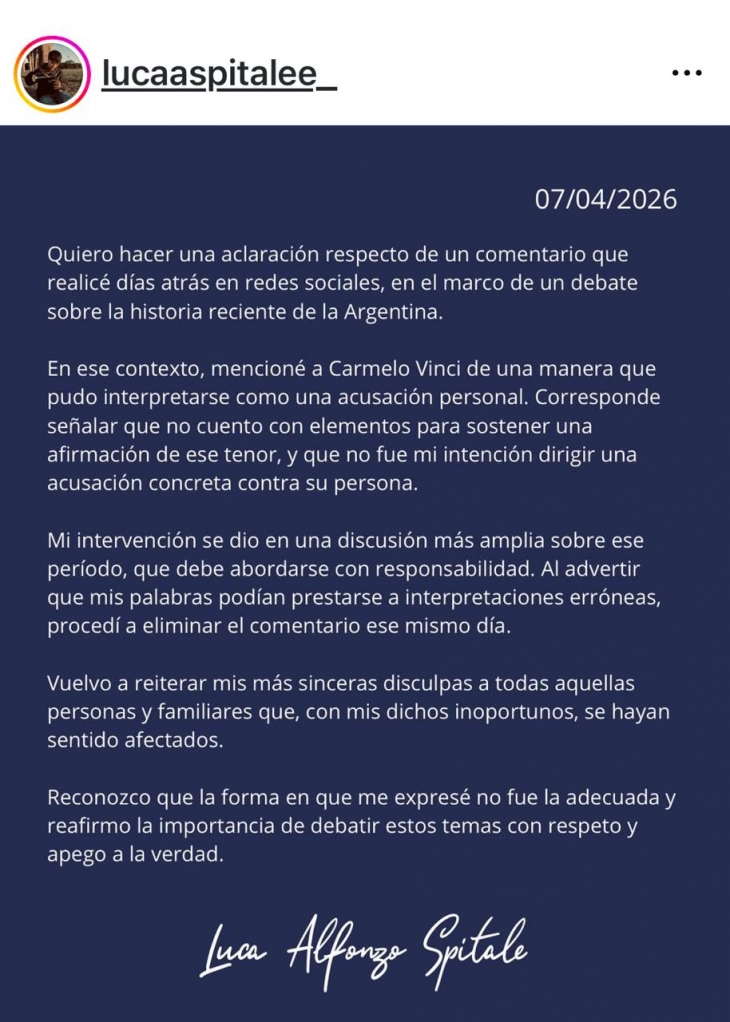 La rectificación llega 24 horas después de que Vinci le enviara una carta documento intimándolo a ratificar o rectificar sus dichos del pasado 24 de marzo, cuando en una publicación de Instagram el joven había afirmado: «Este señor y muchos más también asesinaron personas».