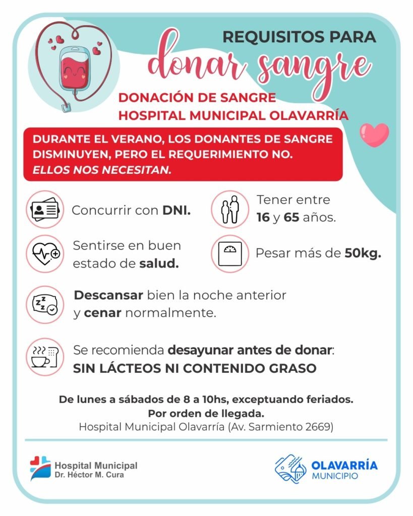 Durante los meses de verano, las donaciones de sangre suelen disminuir, pero las necesidades del sistema de salud continúan sin cambios. Por ese motivo, desde el Servicio de Hemoterapia del Municipio de Olavarría se lanzó una convocatoria a la comunidad para concientizar sobre la importancia de la donación voluntaria, altruista y solidaria.