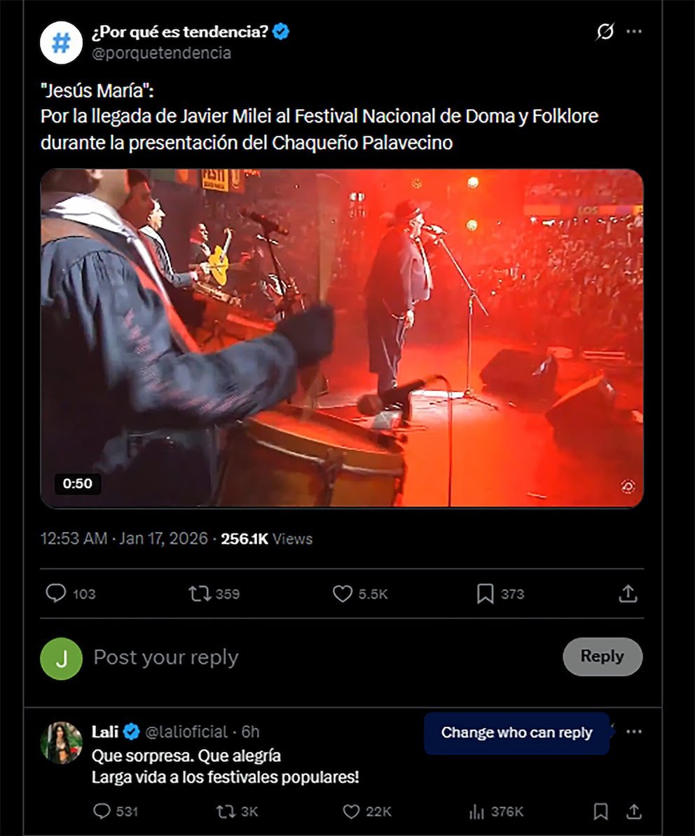 La cantante Lali Espósito volvió a generar repercusión en redes sociales al ironizar sobre la presencia del presidente Javier Milei en el Festival Nacional de Doma y Folklore de Jesús María, en Córdoba, donde el mandatario subió al escenario y cantó junto al Chaqueño Palavecino.